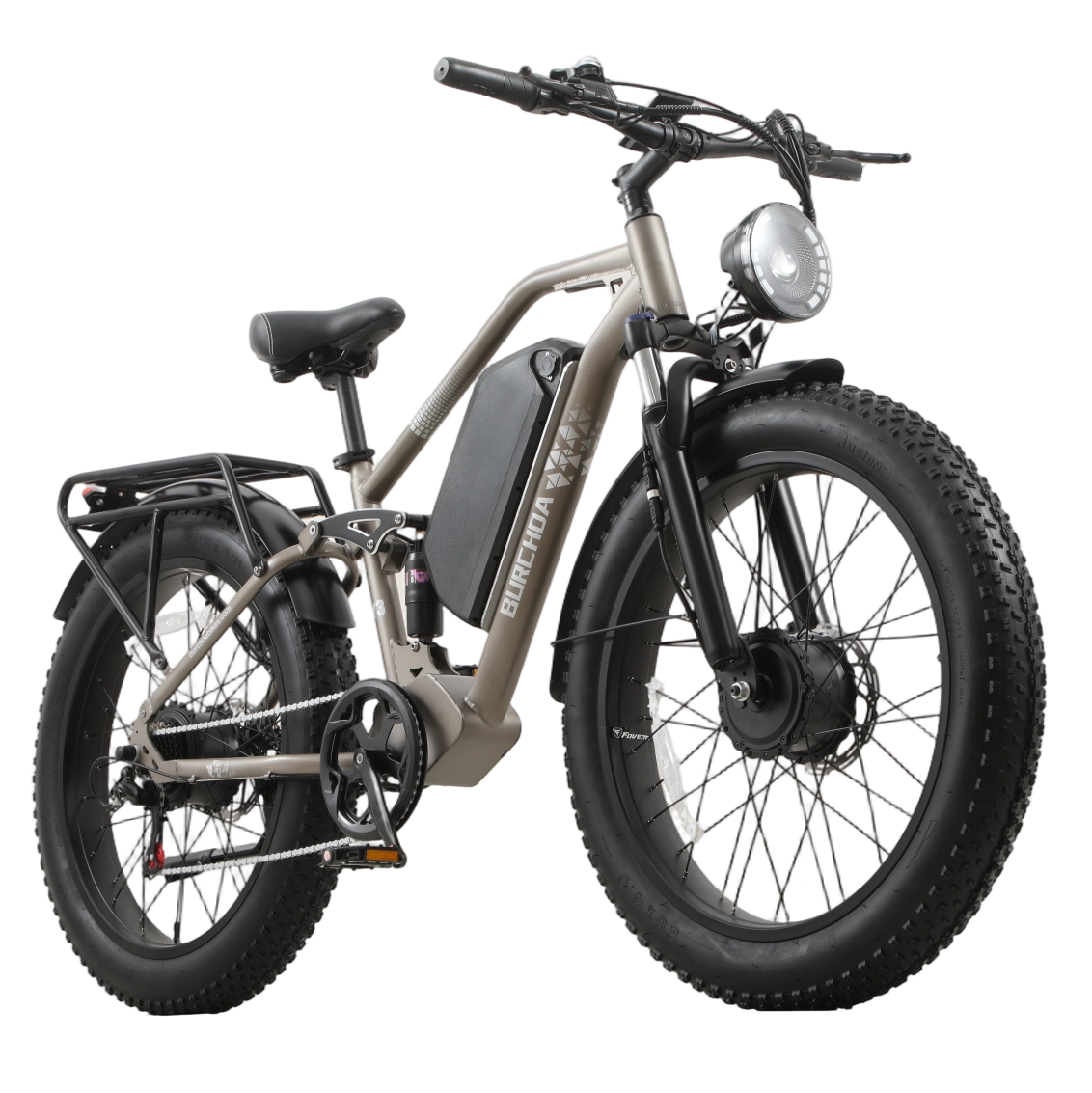 Smooth rides, no limits. Equipped with a custom 160mm adjustable front air fork and up to 125mm rear wheel travel, this dual-suspension system conquers rocky trails, soft sand, muddy slopes, and rough dirt roads with ease. It also absorbs high-frequency vibrations, reducing hand fatigue and delivering a more comfortable, controlled ride.
